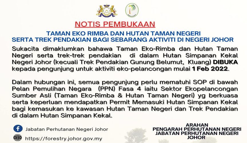 PENGUMUMAN PEMBUKAAN SEMULA TAMAN EKO RIMBA DAN HUTAN TAMAN NEGERI SERTA TREK PENDAKIAN BAGI SEBARANG AKTIVITI DI NEGERI JOHOR