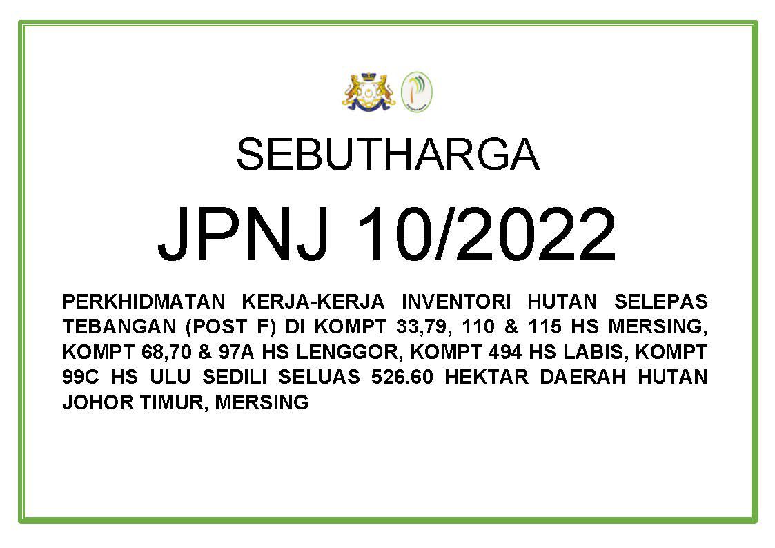JPNJ 10/2022 PERKHIDMATAN KERJA-KERJA INVENTORI HUTAN SELEPAS TEBANGAN (POST F) DI KOMPT 33,79, 110 & 115 HS MERSING, KOMPT 68,70 & 97A HS LENGGOR, KOMPT 494 HS LABIS, KOMPT 99C HS ULU SEDILI SELUAS 526.60 HEKTAR DAERAH HUTAN JOHOR TIMUR, MERSING