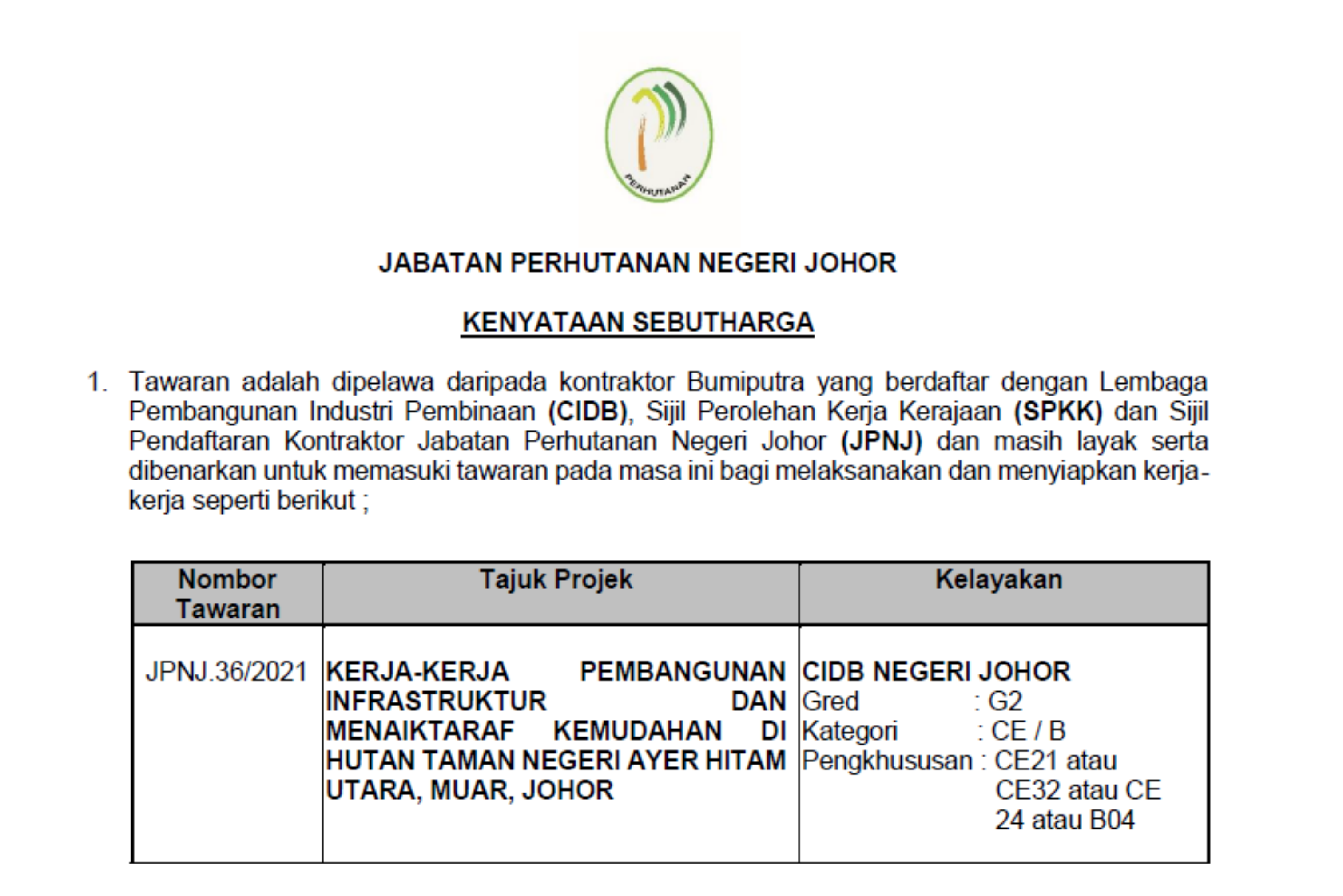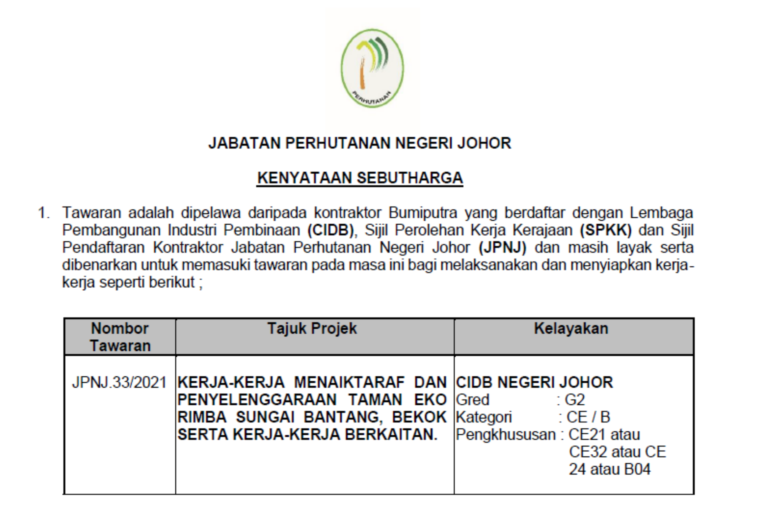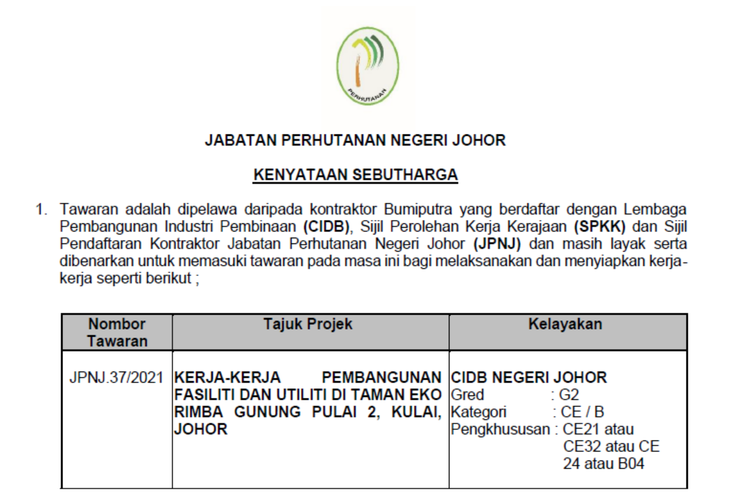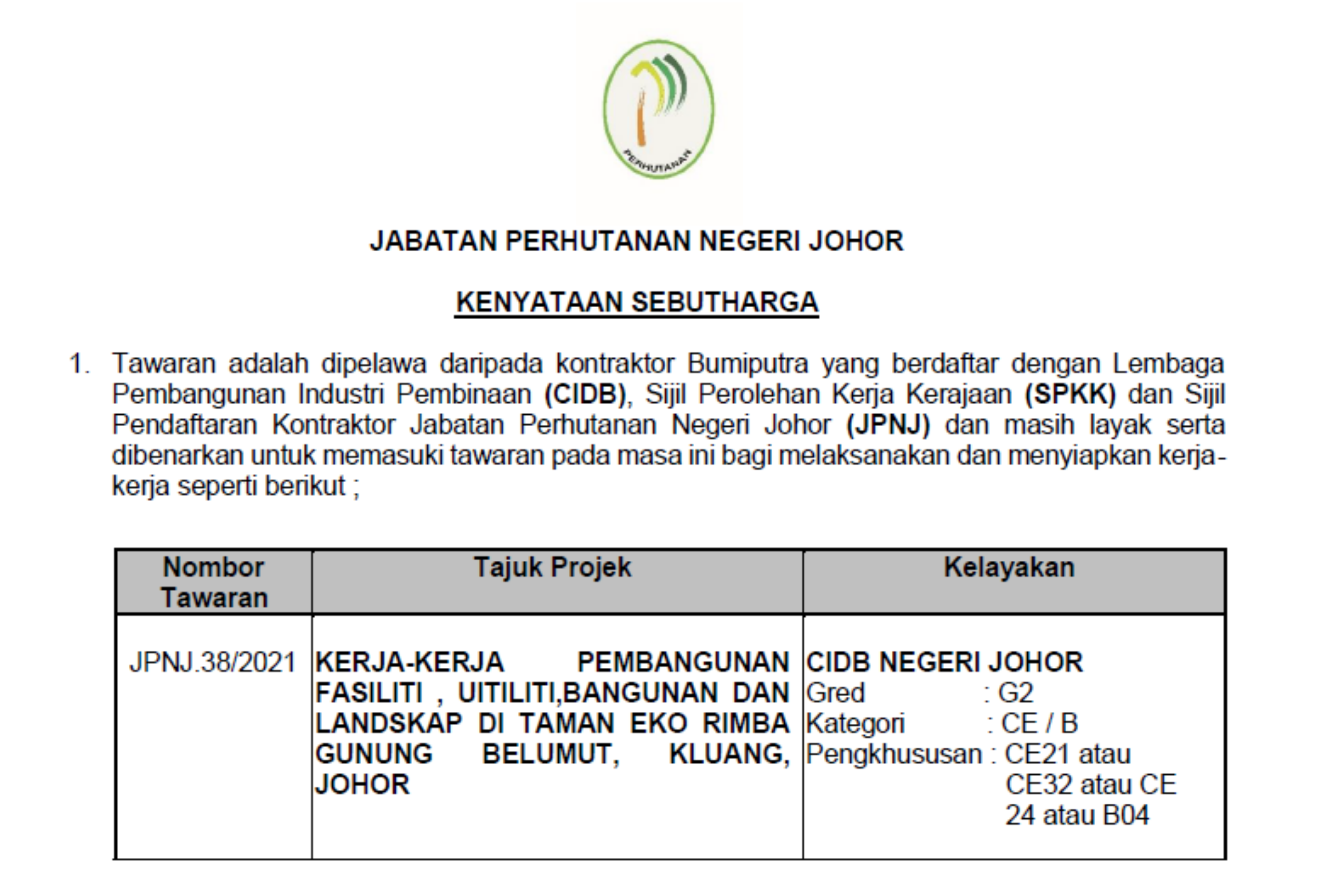 JPNJ 38/2021 KERJA-KERJA PEMBANGUNAN FASILITI , UTILITI,BANGUNAN DAN LANDSKAP DI TAMAN EKO RIMBA GUNUNG BELUMUT, KLUANG, JOHOR