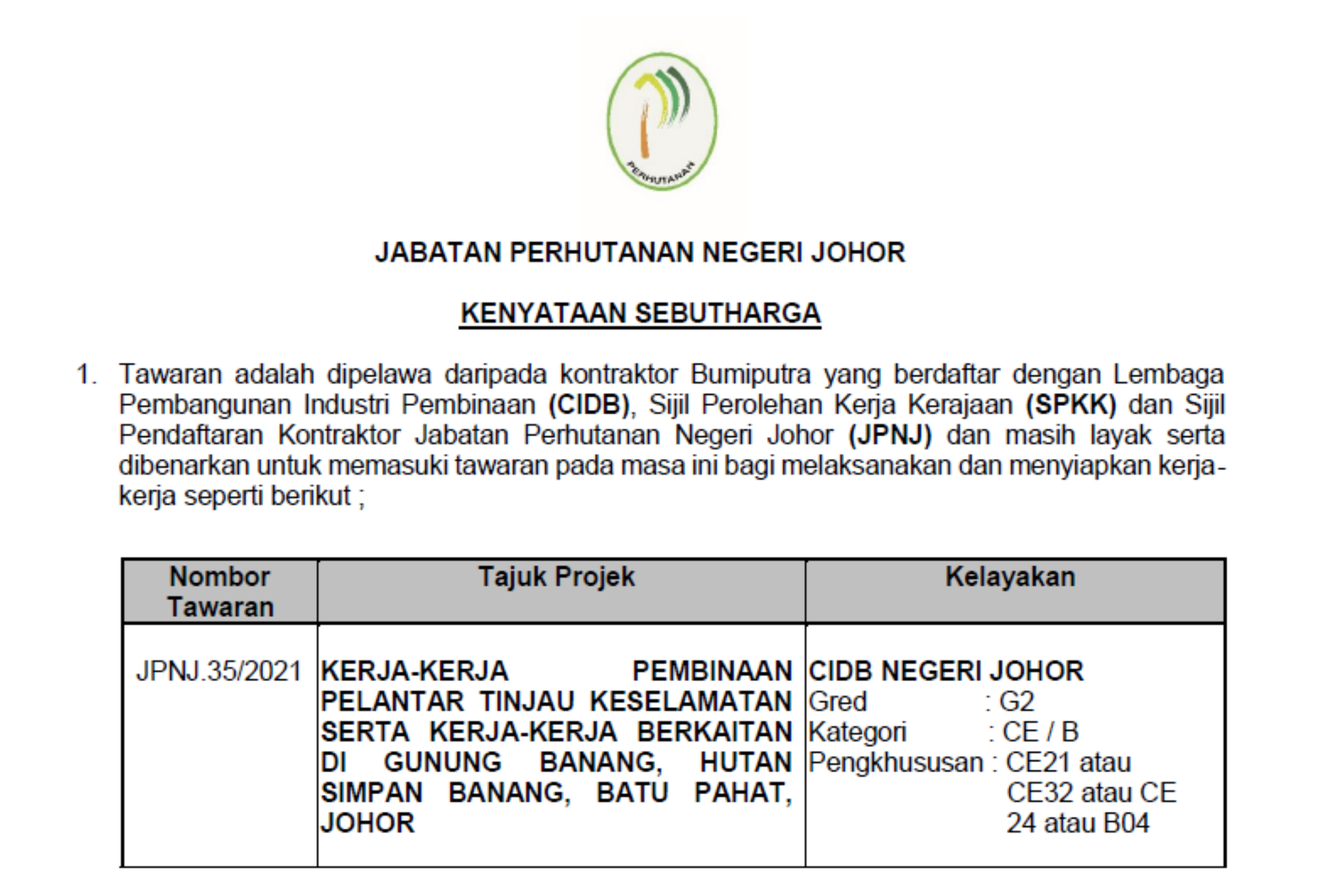 JPNJ 35/2021 KERJA-KERJA PEMBINAAN PELANTAR TINJAU KESELAMATAN SERTA KERJA-KERJA BERKAITAN DI GUNUNG BANANG, HUTAN SIMPAN BANANG, BATU PAHAT, JOHOR
