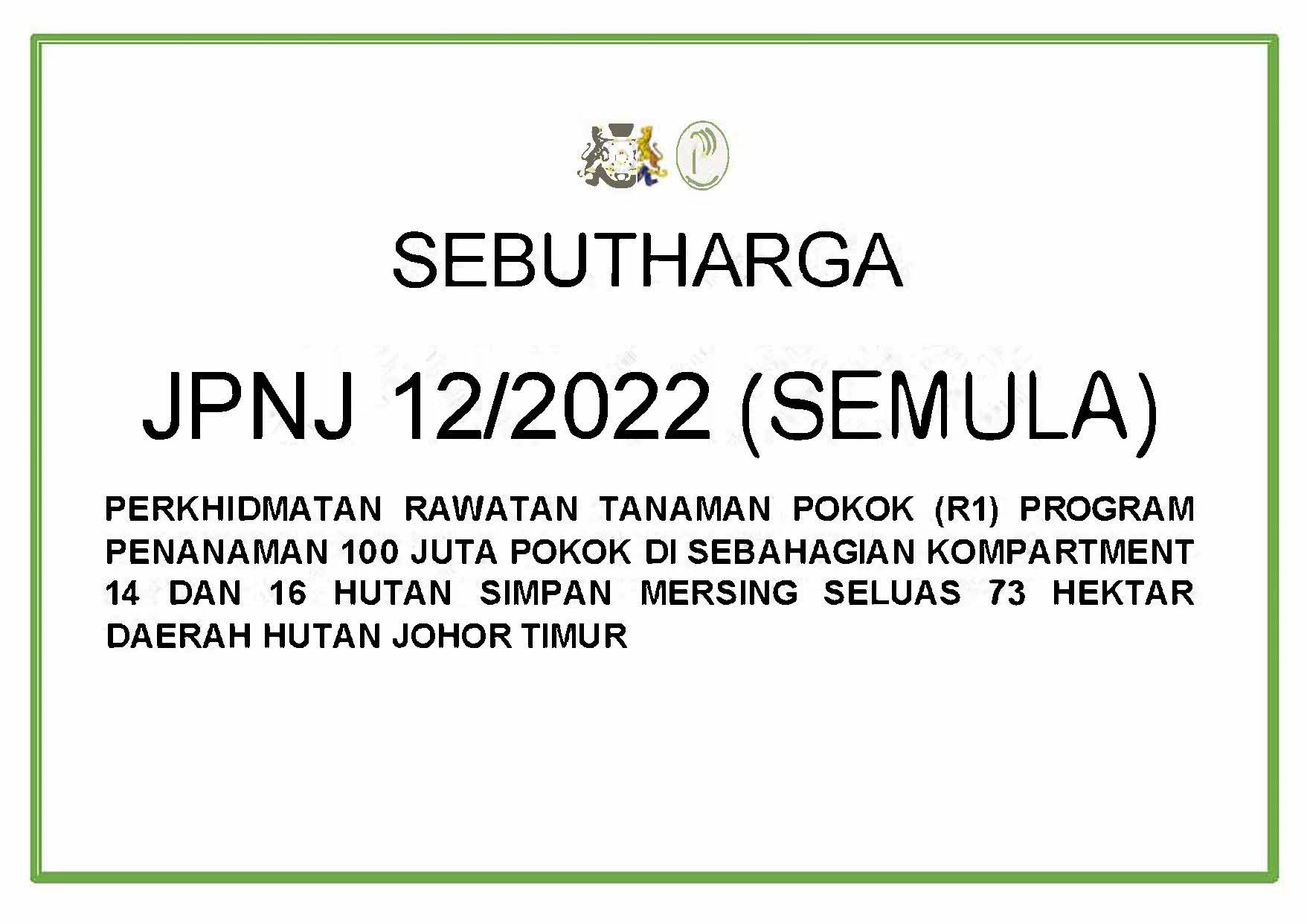 JPNJ 12/2022 (SEMULA) JABATAN PERHUTANAN NEGERI JOHOR MEMPELAWA TUAN/PUAN UNTUK MENYERTAI TAWARAN SEBUTHARGA JPNJ 12/2022 (SEMULA) BAGI PERKHIDMATAN RAWATAN TANAMAN POKOK (R1) PROGRAM PENANAMAN 100 JUTA POKOK DI SEBAHAGIAN KOMPARTMENT 14 DAN 16 HUTAN SIMP