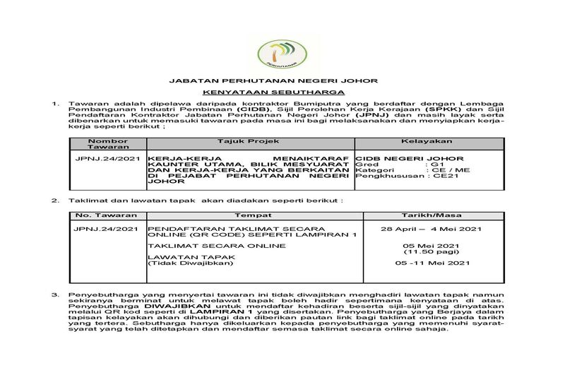 TAWARAN SEBUTHARGA PPNJ 24/2021 BAGI MENJALANKAN KERJA-KERJA MENAIKTARAF KAUNTER UTAMA, BILIK MESYUARAT DAN KERJA-KERJA YANG BERKAITAN DI PEJABAT PERHUTANAN NEGERI JOHOR