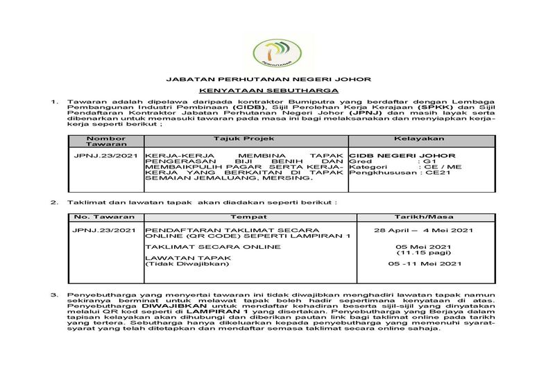 TAWARAN SEBUTHARGA PPNJ 23/2021 BAGI MENJALANKAN KERJA-KERJA MEMBINA TAPAK PENGERASAN BIJI BENIH DAN MEMBAIKPULIH PAGAR SERTA KERJA-KERJA YANG BERKAITAN DI TAPAK SEMAIAN JEMALUANG, MERSING.