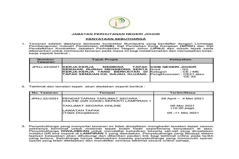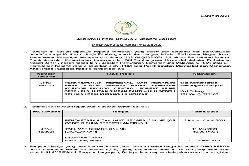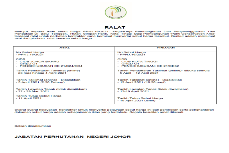 RALAT TAWARAN SEBUTHARGA JPNJ 16/2021 KERJA-KERJA PENGURUSAN DAN PEMBINAAN BARU BAGI MEMBINA LALUAN TREK PENDAKIAN DI BATU TENGGEK SERTA KERJA-KERJA YANG BERKAITAN DI HUTAN SIMPAN PANTI, KOTA TINGGI BAGI PEMBANGUNAN ‘PANTI CONSERVATION AREA’