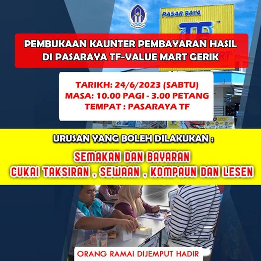 WARGA GERIK YANG INGIN MEMBAYAR ATAU SEMAKAN CUKAI TAKSIRAN , SEWA , LESEN DAN KOMPAUN KAMI MENYEDIAKAN PERKHIDMATAN KAUNTER LUAR DI PASARAYA TF GERIK PADA 24 JUN 2023.