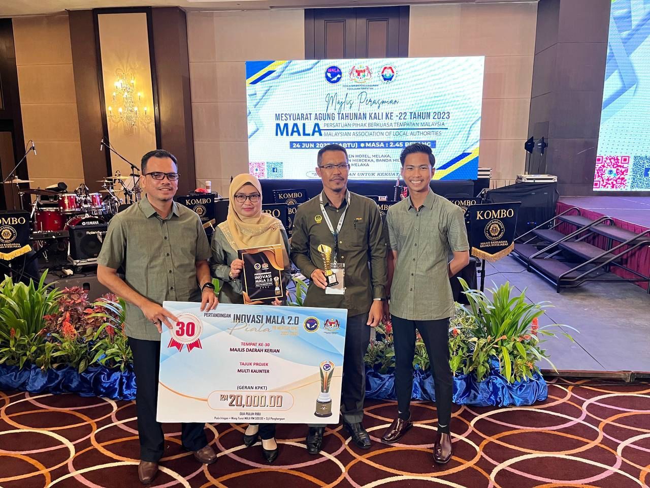 24 JUN – Majlis Penyampaian Hadiah Pertandingan Inovasi MALA 2.0 Piala YB Menteri KPKT Persatuan Pihak Berkuasa Tempatan Malaysia telah diadakan di Hatten Hotel, Melaka. Sesi penyampaian hadiah ini disempurnakan oleh YB. Datuk Rais bin Datuk Wira Yasin, EXCO Kanan Perumahan, Kerajaan Tempatan, Saliran, Perubahan Iklim dan Pengurusan Bencana diiringi YBhg. Datuk Hj. Shadan bin Hj. Othman, Datuk Bandar MBMB merangkap Presiden Persatuan Pihak Berkuasa Tempatan Malaysia (MALA). Tahniah diucapkan kepada Kumpulan Inovatif dan Kreatif (KIK) Majlis Daerah Kerian iaitu Kumpulan Meteor dan Kumpulan One-Off yang mendapat tempat ke-17 dan ke-30 daripada 69 kumpulan inovasi yang bertanding. Kedua-dua kumpulan telah menerima hadiah geran KPKT keseluruhannya berjumlah RM 50,000.00 dan wang tunai RM 1,000.00. Semoga kejayaan ini memberi impak positif terhadap penyampaian perkhidmatan terbaik Majlis Daerah Kerian.
