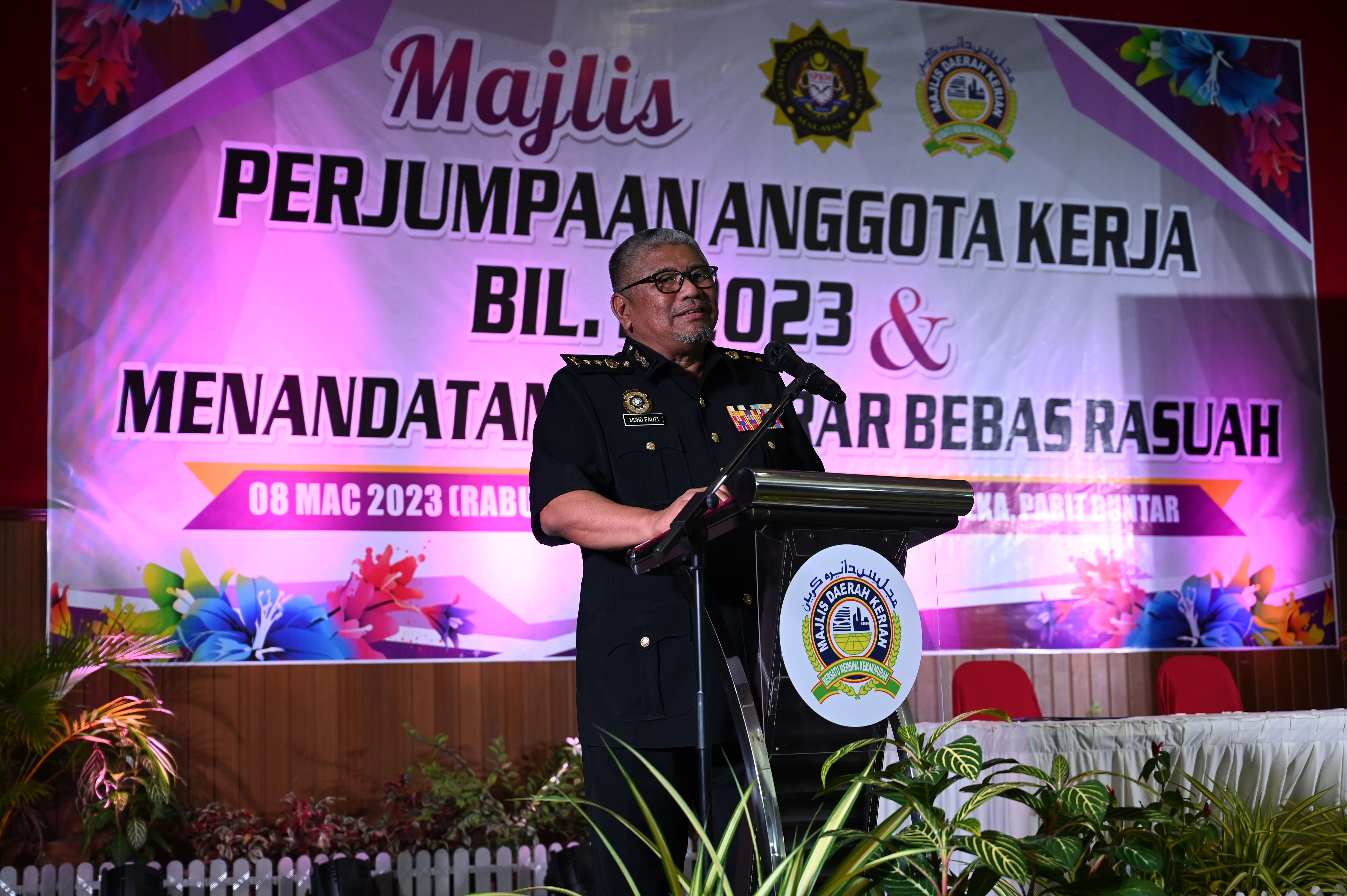 8 Mac 2023 – Majlis Daerah Kerian (MDK) melalui Unit Integriti telah mengadakan Majlis Menandatangani Ikrar Bebas Rasuah (IBR) sempena Majlis Perjumpaan Kakitangan bil 2/2023 di Dewan Merdeka, Parit Buntar khusus untuk warga MDK bersama Tuan Helmi Bin Yusof@Jusoh, Yang Dipertua MDK.
