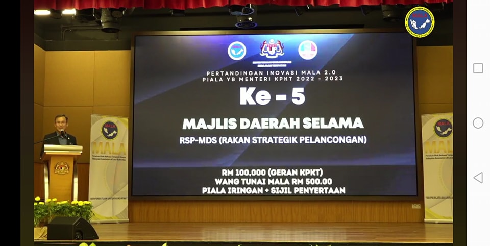Inovasi Rakan Strategik Pelancongan (RSP-MDS) terus diiktiraf. Ianya kali ini di peringkat kebangsaan apabila diumumkan sebagai pemenang di tempat KELIMA dalam Pertandingan Inovasi MALA 2.0 Piala Menteri Kementerian Pembangunan Kerajaan Tempatan (KPKT) tahun 2022-2023 anjuran Persatuan Pihak Berkuasa Tempatan Malaysia (MALA).