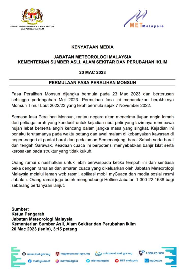 Jabatan Metereologi Malaysia (MET) pada 20 Mac 2023 lalu telah mengeluarkan kenyataan bahawa Fasa Peralihan Monsun ini akan membawa hujan lebat bersama angin kencang dalam tempoh singkat dan fenomena ini dijangka boleh berterusan sehingga pertengahan Mei 2023.