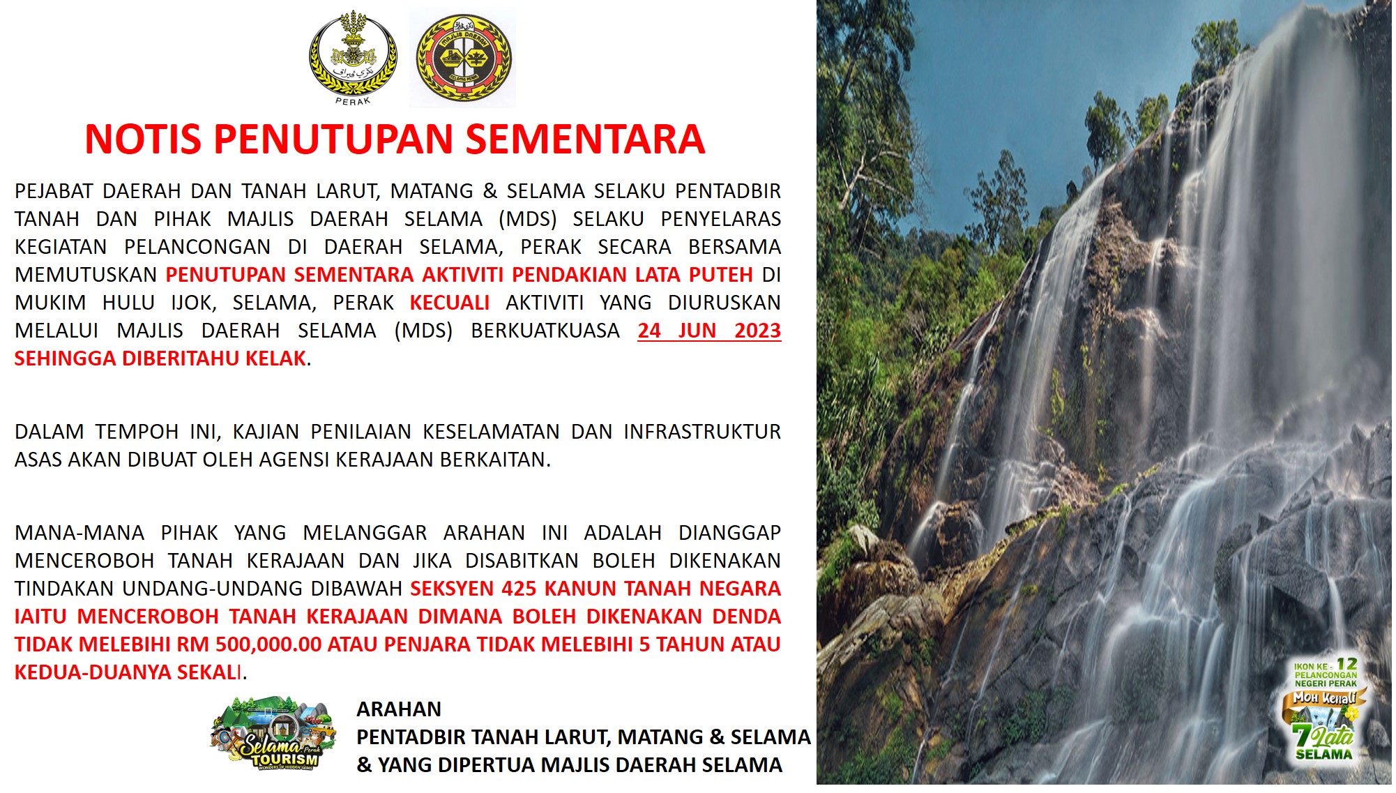 Berdasarkan insiden kemalangan yang berlaku ke atas pendaki persendirian baru-baru ini, Pejabat Daerah dan Tanah Larut, Matang & Selama selaku Pentadbir Tanah dan pihak Majlis Daerah Selama (MDS) selaku penyelaras kegiatan pelancongan di daerah Selama, Perak secara bersama memutuskan penutupan sementara aktiviti pendakian Lata Puteh di Mukim Hulu Ijok, Selama, Perak kecuali aktiviti yang diuruskan melalui Majlis Daerah Selama (MDS) berkuatkuasa pada 24 JUN 2023 sehingga diberitahu kelak.