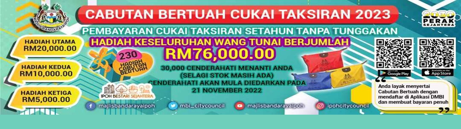 Hakcipta Terpelihara © 2023 Majlis Bandaraya Ipoh (MBI). Sesuai dipapar menggunakan IE versi 9 & ke atas, Mozilla Firefox versi 6.0 ke atas dan Google Chrome 13.0 ke atas dengan resolusi 1024 x 768 ke atas. Kemaskini :