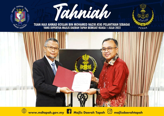TAHNIAH TUAN HAJI AHMAD ROSLAN BIN MOHAMED NAZIR DI ATAS PELANTIKAN SEBAGAI YANG DIPERTUA MAJLIS DAERAH TAPAH