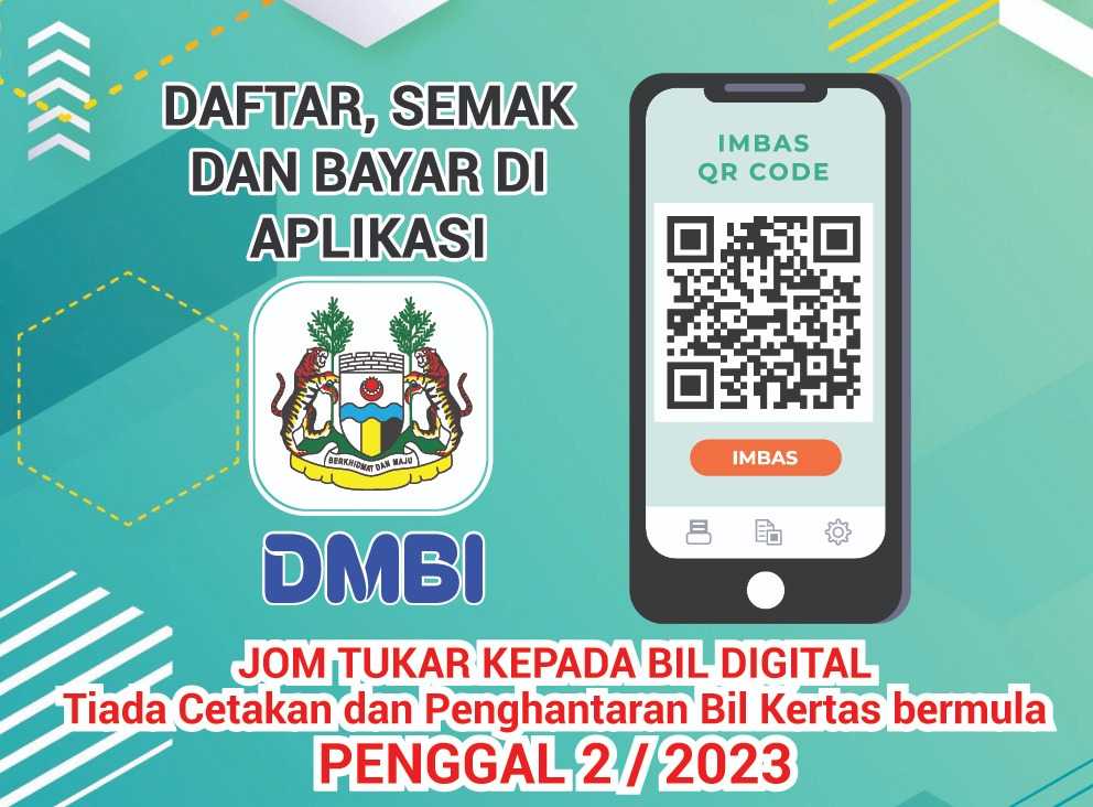 Untuk Makluman, Majlis Bandaraya Ipoh Dalam Proses Kearah Bil Digital. Tiada Penghantaran atau Pengeposan Bil Cukai Taksiran Majlis Bandaraya Ipoh Secara Cetakan Bermula Penggal Kedua Tahun 2023. Pemilik Pegangan/Harta Dinasihatkan Mendaftar di Aplikasi DMBI Dengan Memuat turun di Google Play, App Store, App Gallery Atau Di Laman Web Majlis Bandaraya Ipoh.
