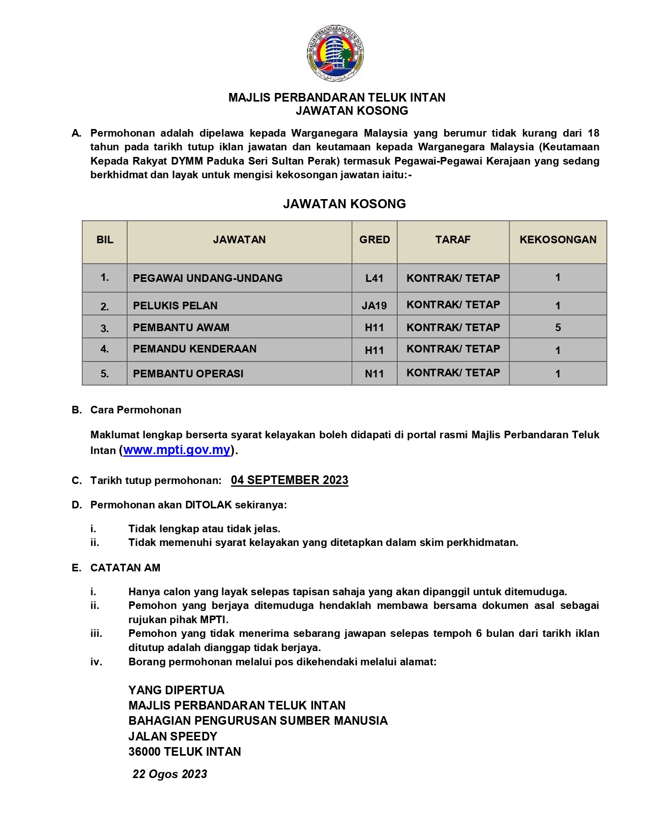 Hakcipta Terpelihara © 2023 Majlis Perbandaran Teluk Intan. Sesuai dipapar menggunakan IE versi 9 & ke atas, Mozilla Firefox versi 6.0 ke atas dan Google Chrome 13.0 ke atas dengan resolusi 1024 x 768 ke atas. Kemaskini : 10/10/2023 | Jumlah Pelawat : 38121